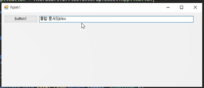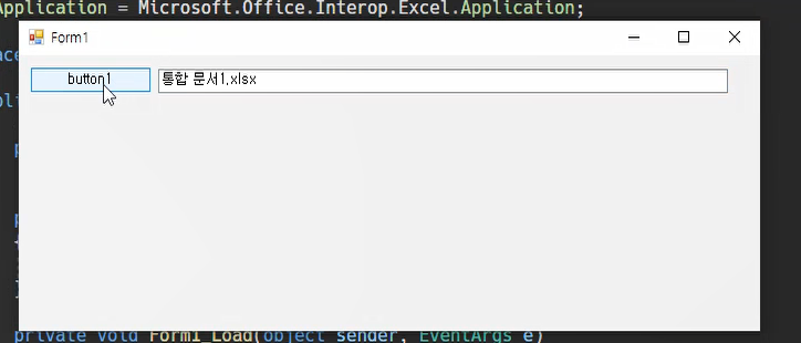 // 버튼을 누르면 텍스트 박스에 엑셀 어플리케이션이 열고 있는 엑셀 파일 명을 표시해 보겠습니다.