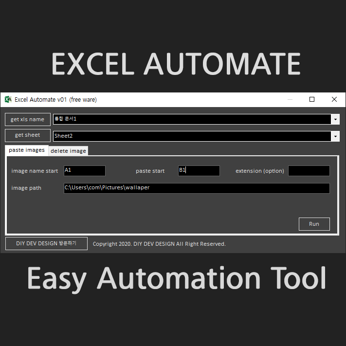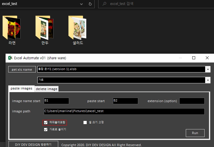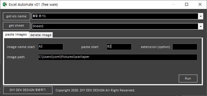 요 상태에서 Run 버튼을 누르시면 바로 엑셀 시트에 이미지가 붙게 됩니다.