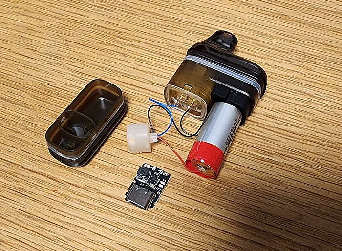 1회용 전자 담배에 배터리를 교체하고 (배터리 상태가 좋다면 그냥 사용해도 무방함) 배터리 충전 회로를 추가하면 이제 더이상 1회용이 아닌 다회용으로 사용이 가능하게 됩니다. ㅎㅎ