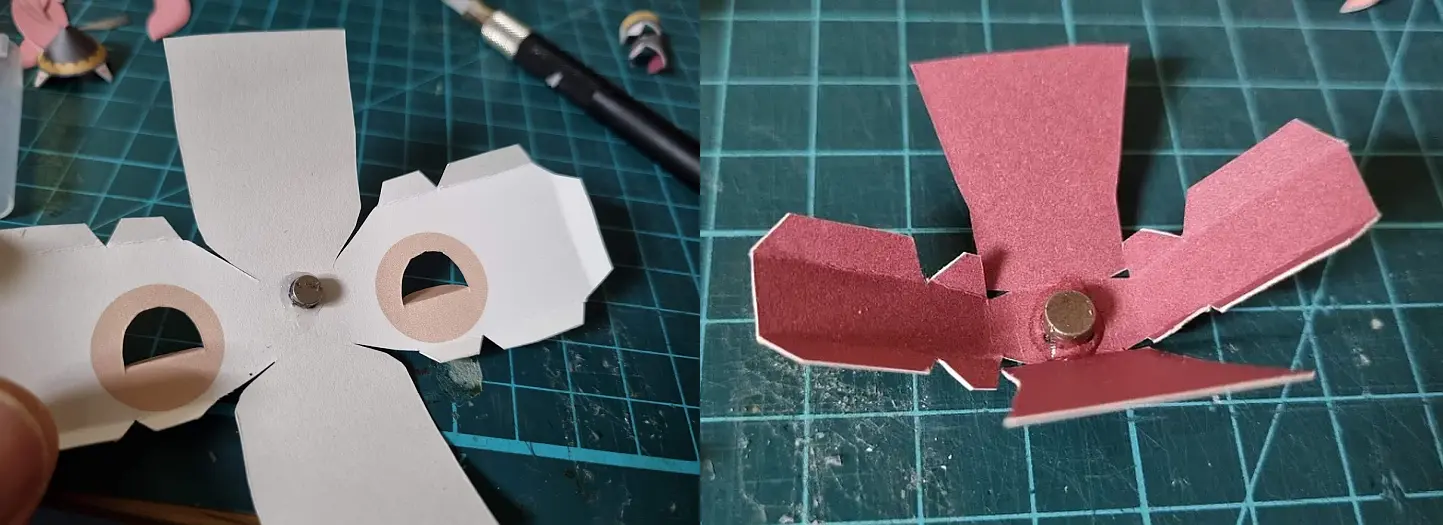몸통의 윗부분과 머리의 아래쪽에 조그마한 네오디움 자석을 붙여주는 겁니다. 이렇게 되면 머리를 따로 풀로 접착하지 않아도 잘 붙어있으며 좌우로 회전이 된다는 놀라운 사실!! ㅋㅋ