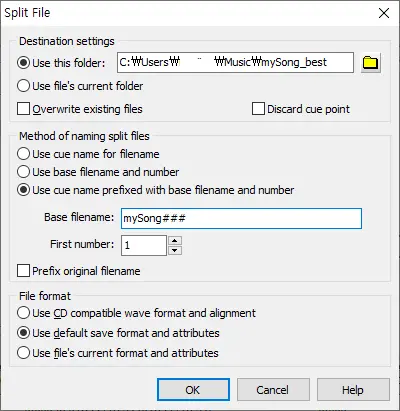어쨌든 이렇게 자동으로 큐가 추가된 리스트를 개별의 음원으로 저장하는 방법은 위에 빨간 네모박스가 표시된 Split File 버튼을 눌러주면 됩니다.