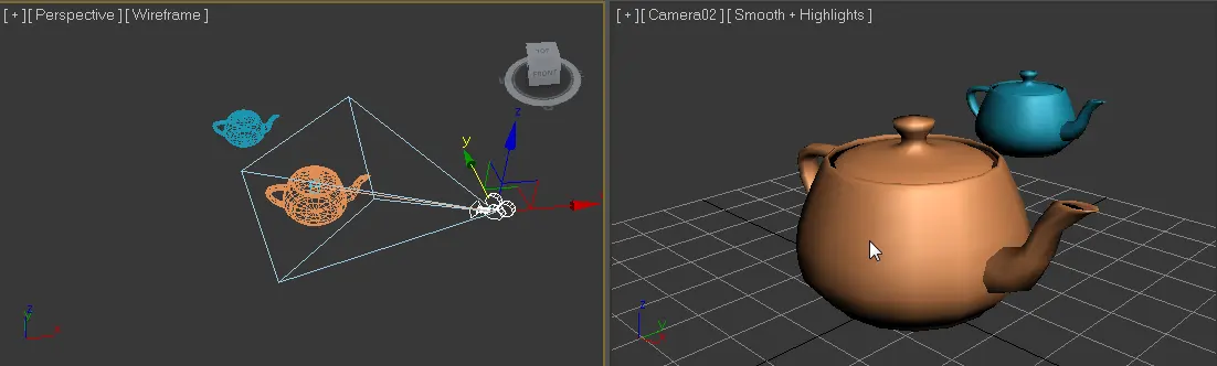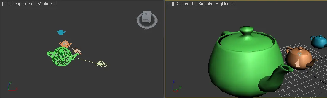 Teapot01 이라는 개체가 있다고 했을 때 항상 카메라를 XY 평면에서 우하단, Z 위치로 약간 위에서 보는 각도에서 보도록 만들어 줄 수 있습니다. 어쩌면 Teapot 의 크기가 크건 작건 항상 적당한 위치에 생성하는 것도 가능하겠죠. 아래 코드를 봐주세요.